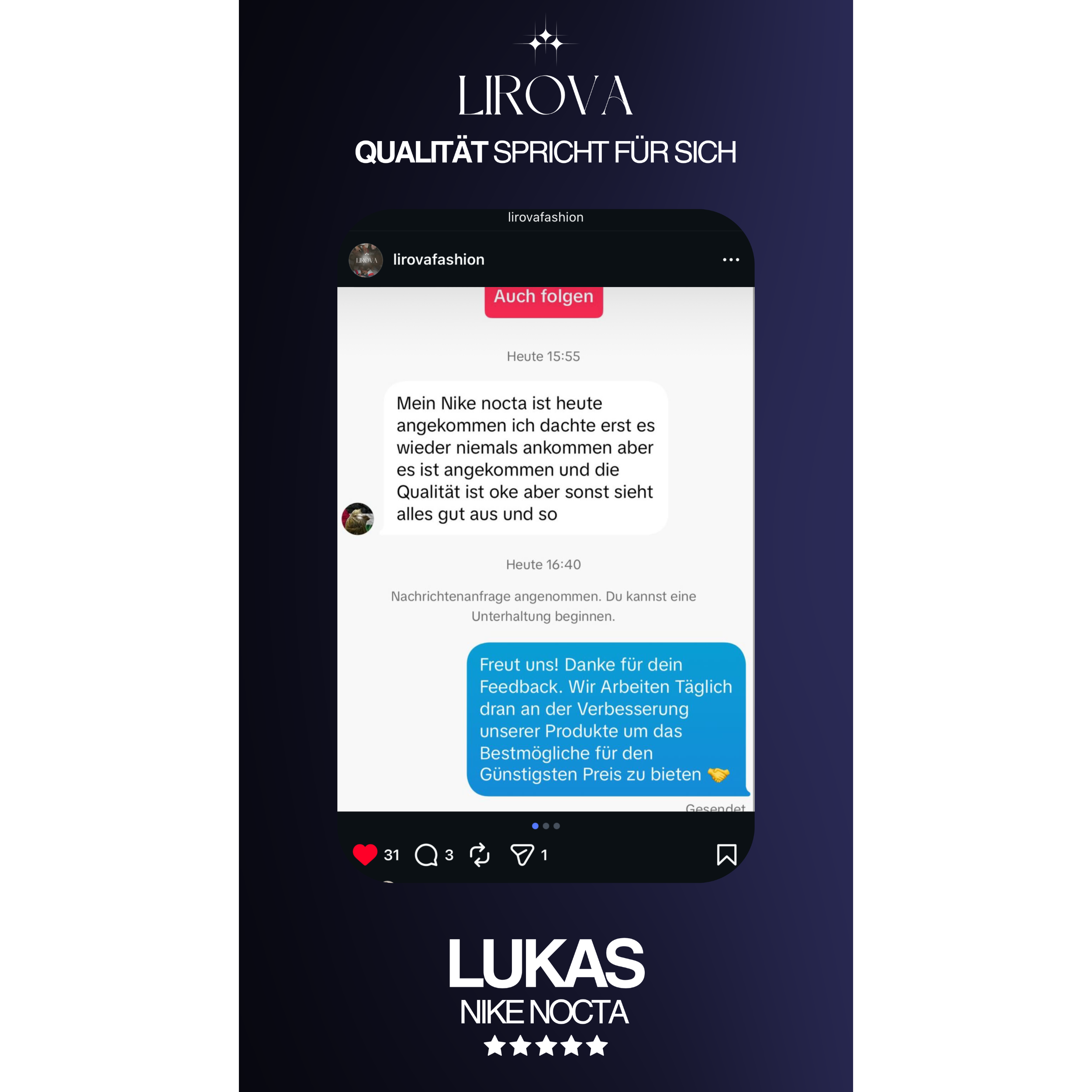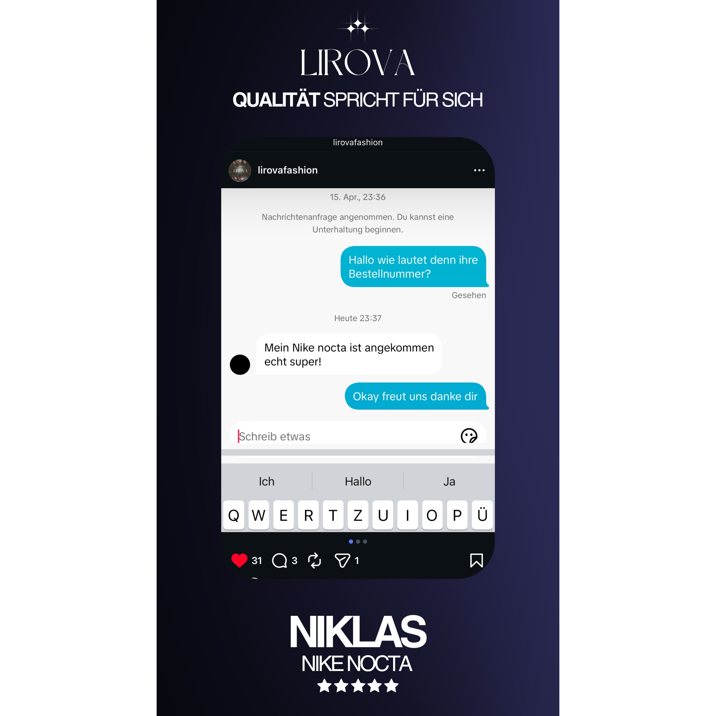 Falls dein Paket nicht angekommen ist oder beschädigt wurde, kontaktiere uns bitte sofort unter Lirovafashion@gmail.com Wir kümmern uns um eine schnelle Lösung.